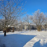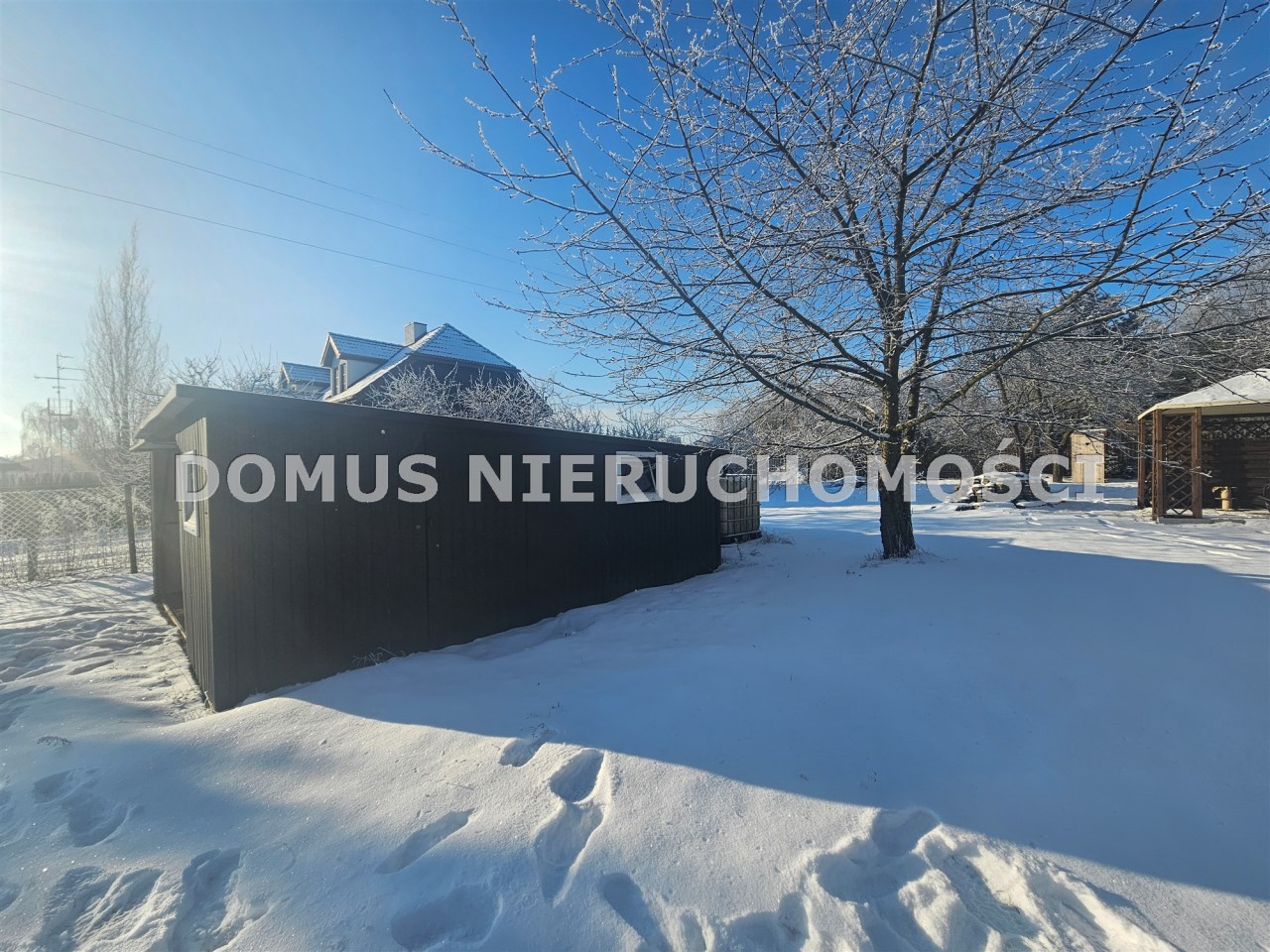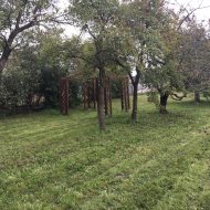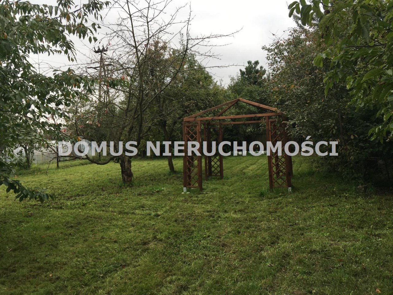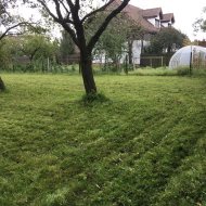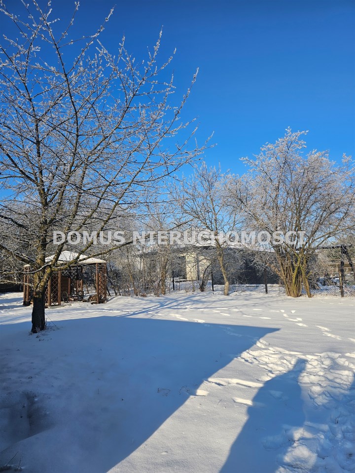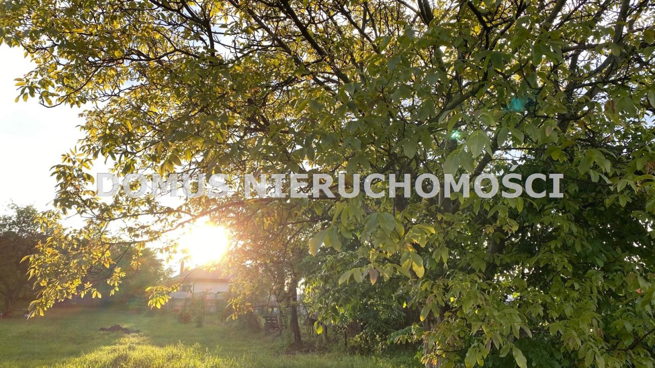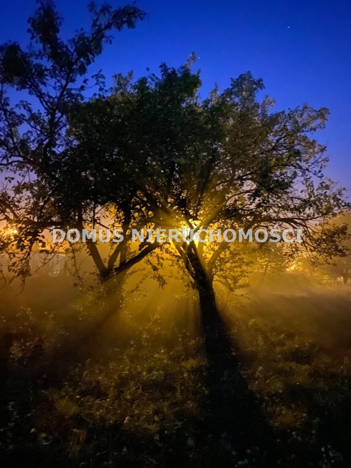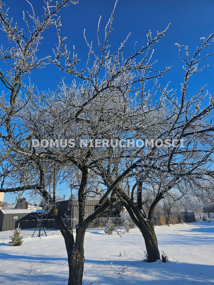 Na działce jest kilka drzew owocowych i drewniana altana. Działka jest płaska.