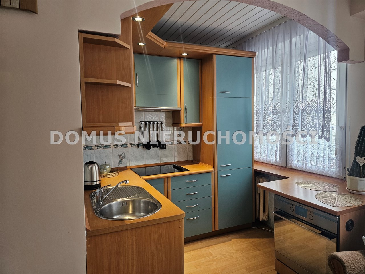 Kuchnia w aneksie kuchennym z miejscem dla gości , wyposażona w meble , kuchenkę gazową ,